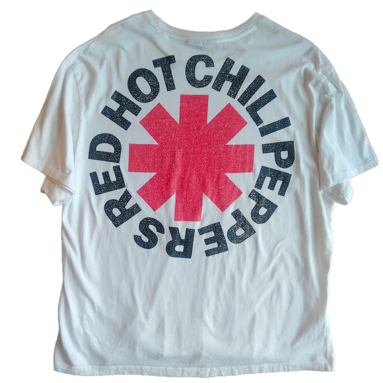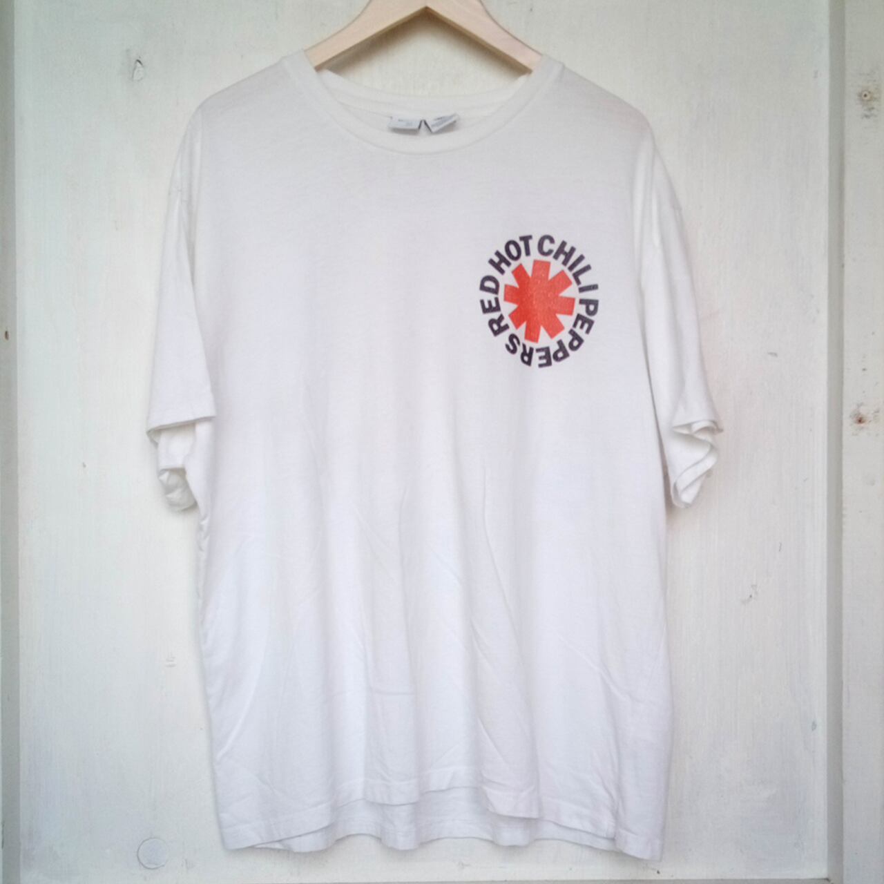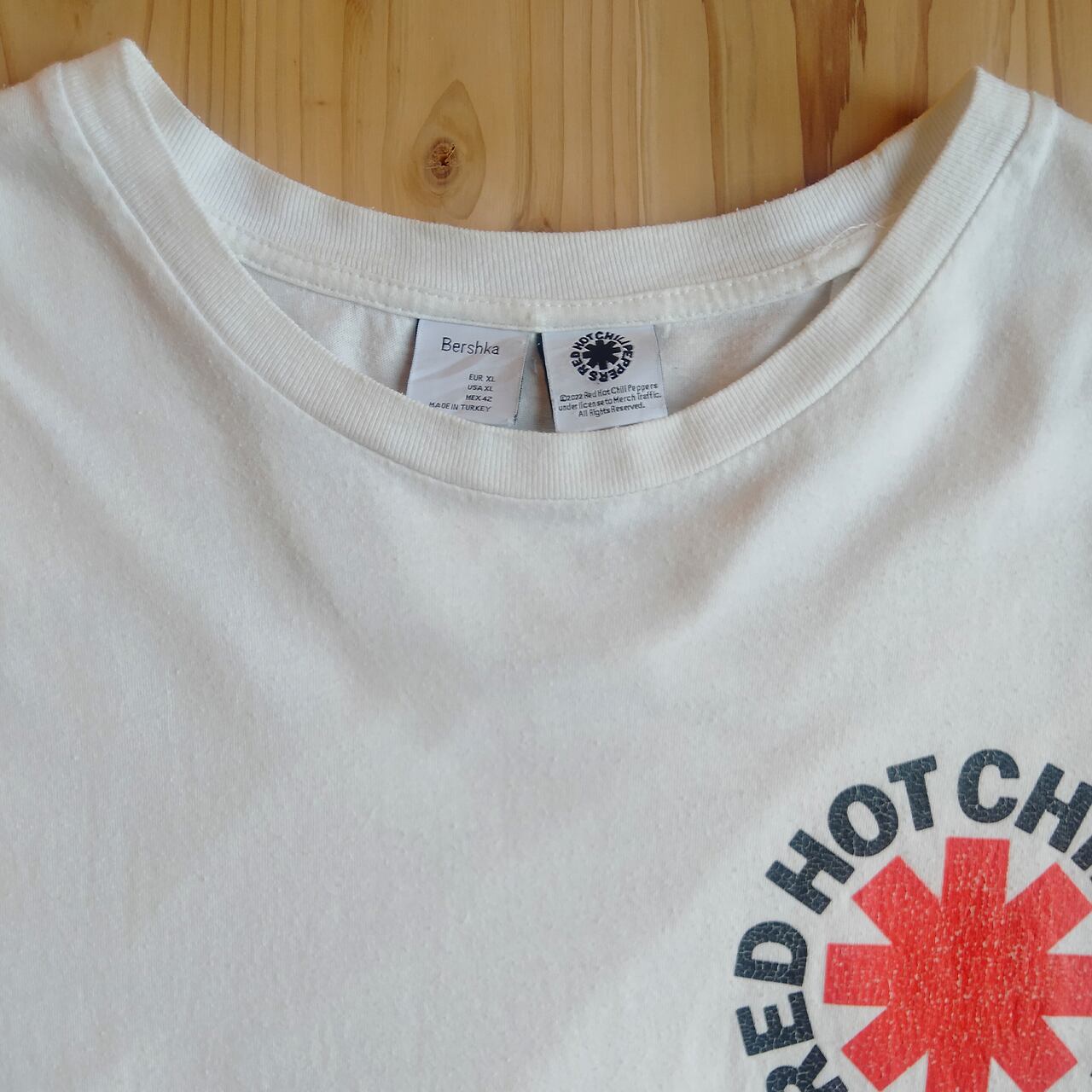 アメリカのロックバンド、レッド・ホット・チリ・ペッパーズの象徴的ロゴが背中に大きく入ったTシャツです。