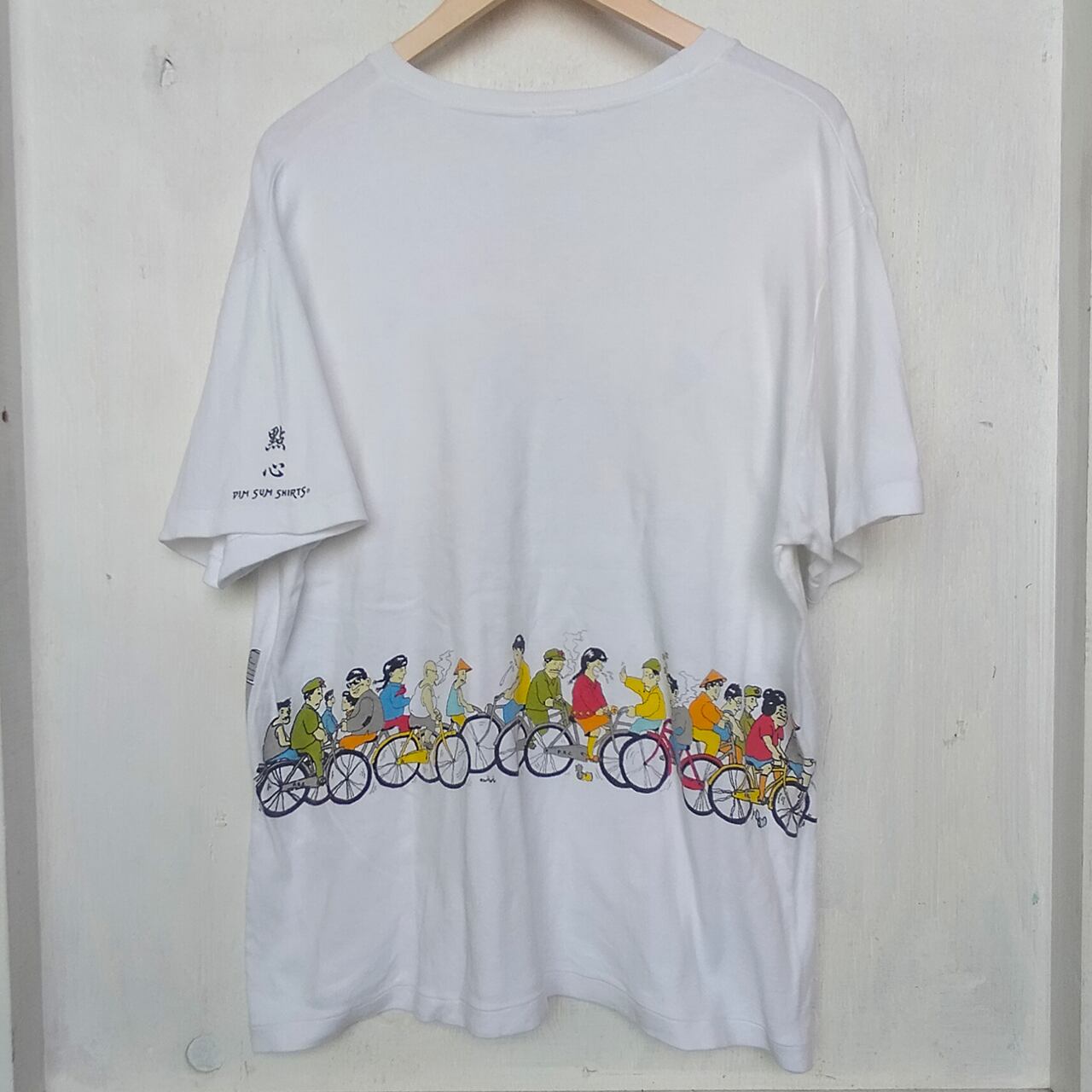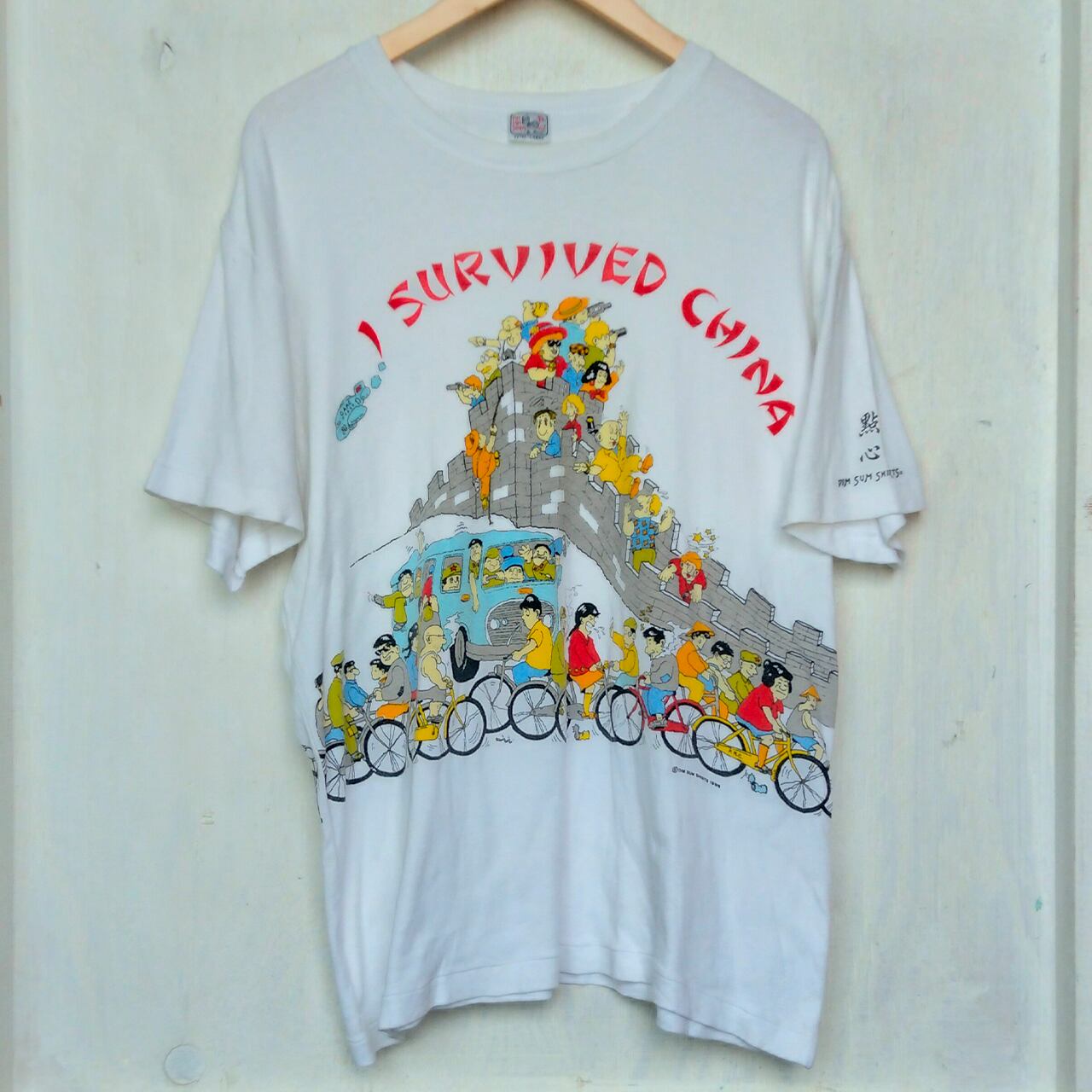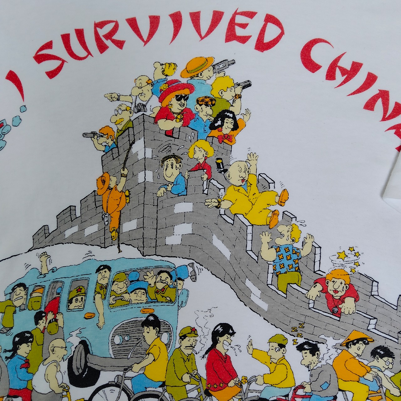 自転車にまたがった人々が、表も裏もぐるっと一周しているユニークなデザインの"I Survived China" (中国旅行から生還したぞ)Tシャツ。ヴィンテージ感満載の愉快な絵柄が印象的な一品です。