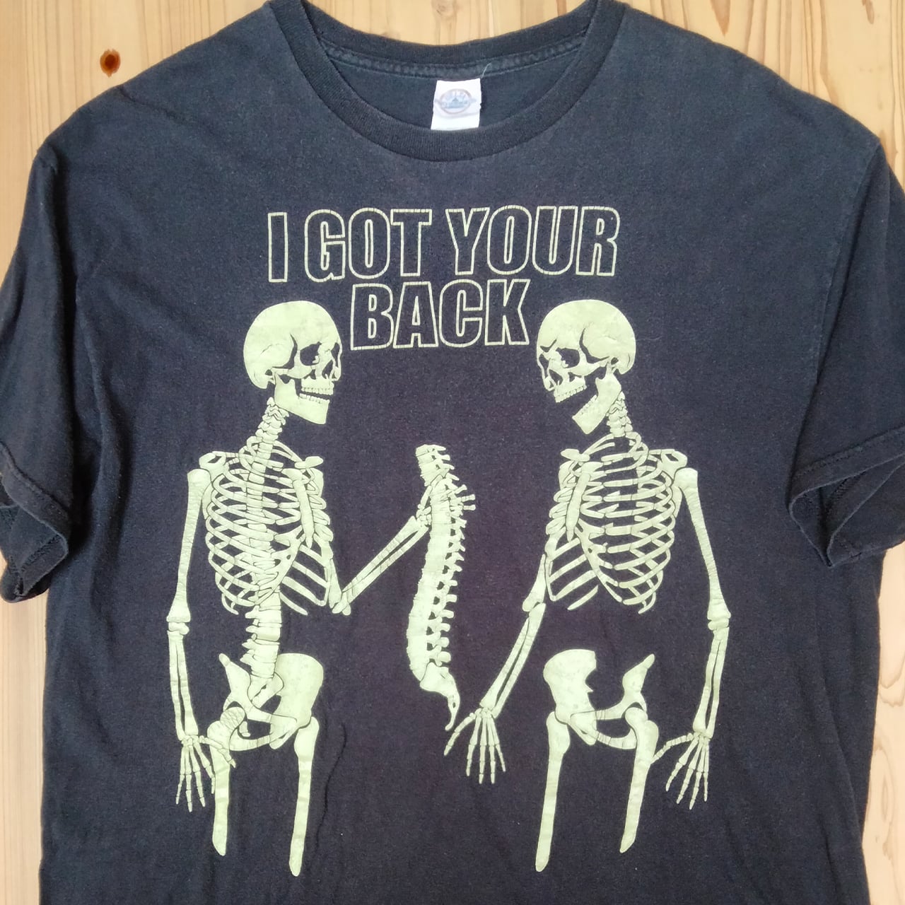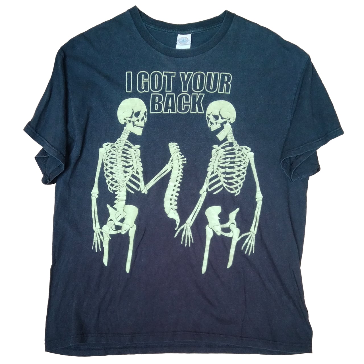 暗闇でスケルトンが光る、ユニークな"I Got Your Back"Tシャツです。