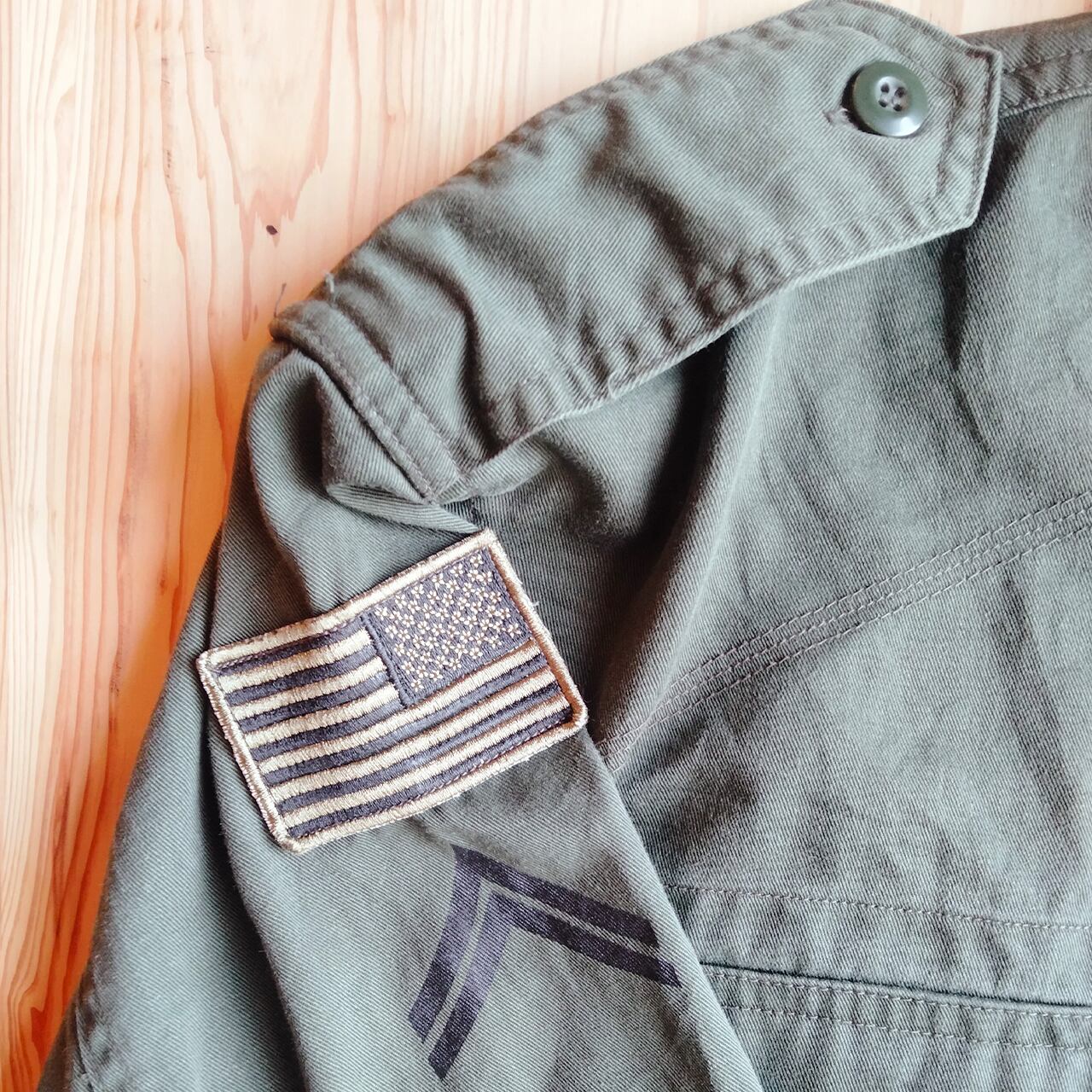胸元にはダブルフラップポケット、アメリカ国旗、U.S.ARMY、RECON(偵察部隊)のワッペンが縫い付けられたロールアップシャツ。オフィシャルユニフォームなだけあって、生地も縫製もしっかりしています。