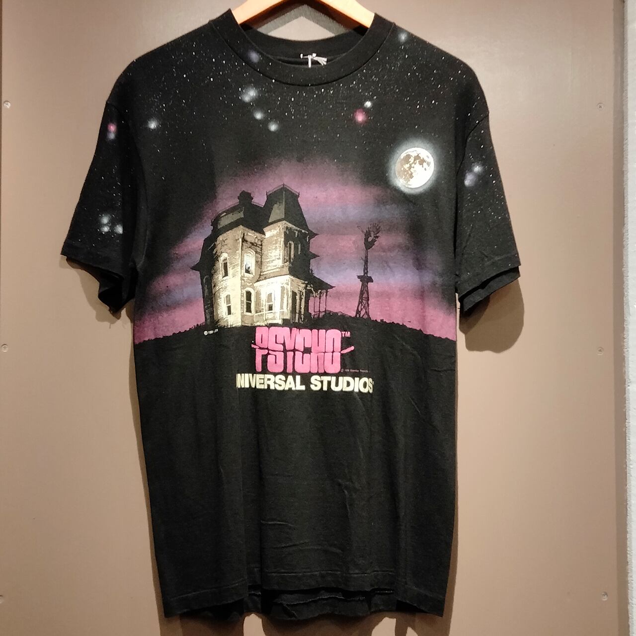 ユニバーサルスタジオの映画『Psycho』ヴィンテージTシャツ。有名な『サイコ』ハウスのシルエットと肩と袖にも広がる星空が美しいプリントTシャツです。
