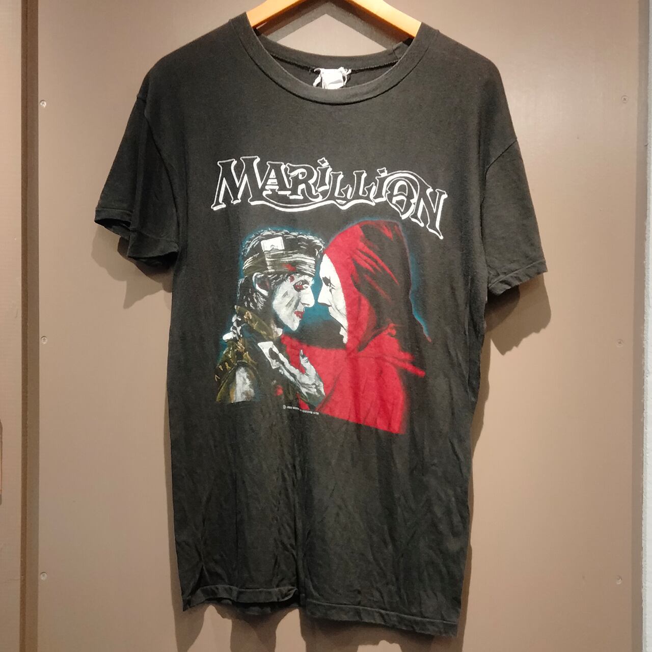 プログレッシブ・ロックバンドMarillionの名曲「Assassing」シングルカバーアートがプリントされたヴィンテージTシャツです。独特のアートワークが魅力の一着で、ファン必見のコレクターズアイテムとしても楽しめます。