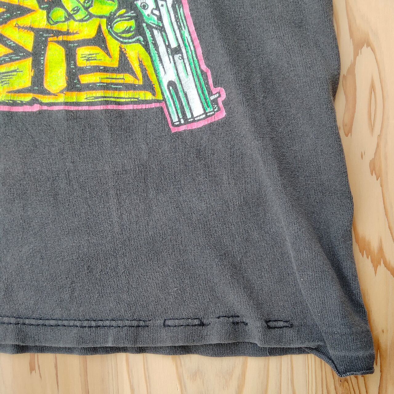 状態:使用感あり、全体的に色あせあり、プリント部分に破れ数ヶ所、すそ周りに破れ数ヶ所、えりぐり、裾に縫製のほつれあり、右脇に穴あり