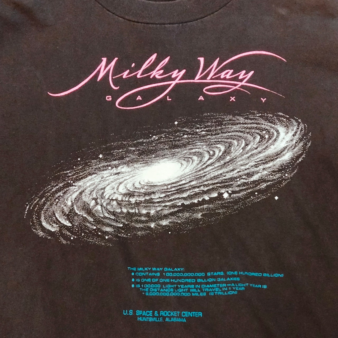 宇宙の神秘を感じさせるミルキーウェイギャラクシーのグローインザダーク(蓄光)Tシャツ!闇に光る独特のスタイルが魅力的。アメリカ合衆国アラバマ州の宇宙ロケットセンターのTシャツです。