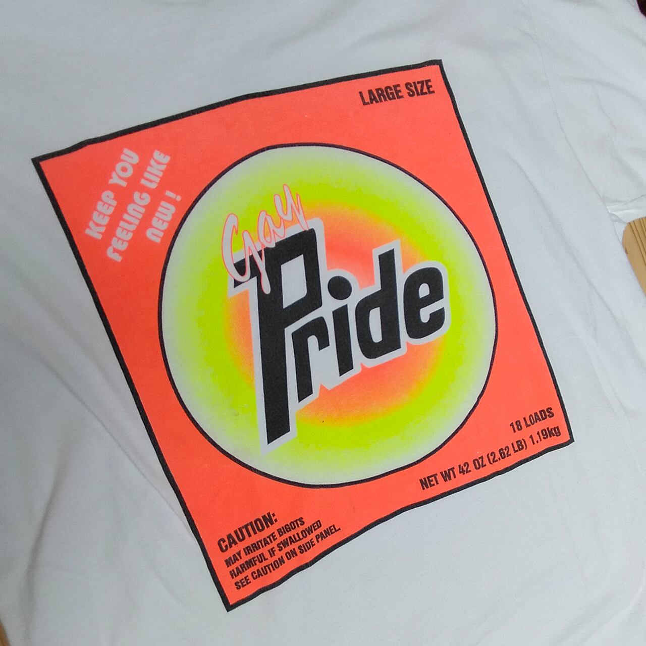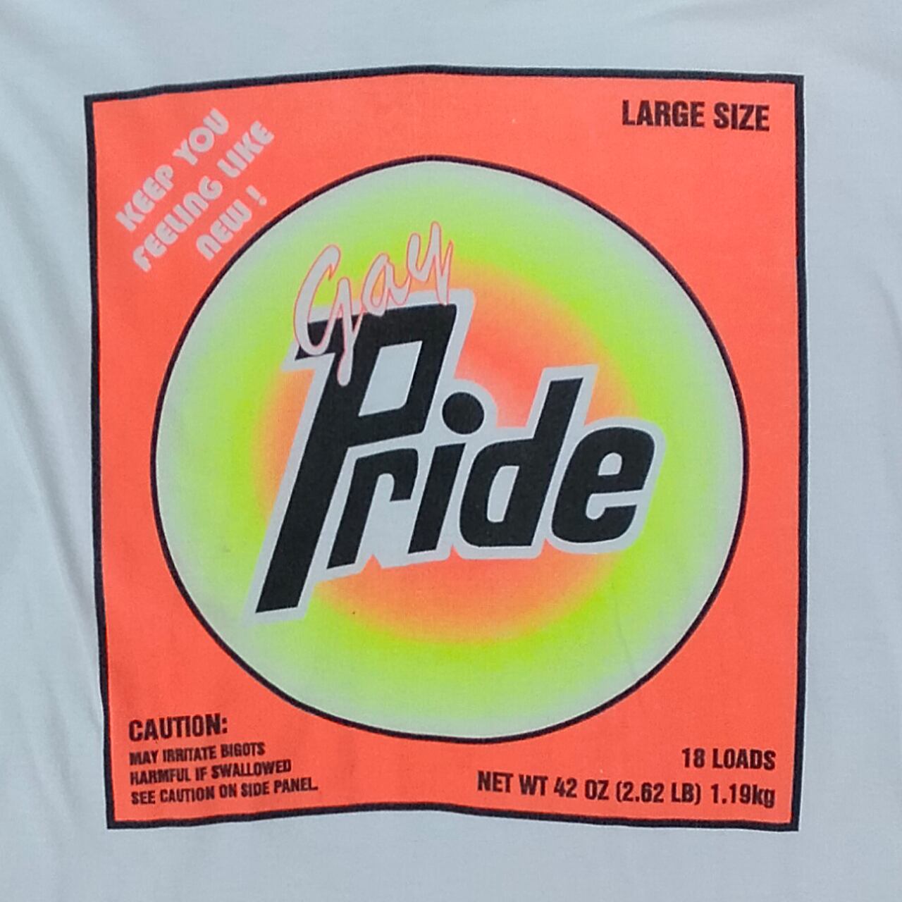 洗濯用洗剤『Tide』のデザインをパロディした『Pride』Tシャツ。ゲイプライドを象徴するデザインで、鮮やかでアイコニックなプリントが特徴です。多様性が叫ばれる時代にぴったりの一枚です。普段使いやイベントにも活躍すること間違いなし!