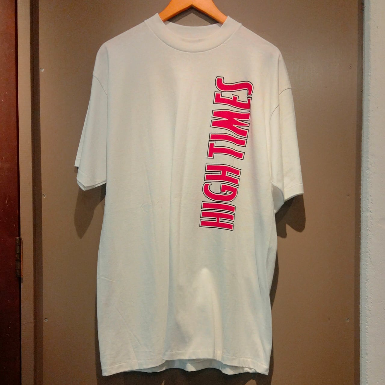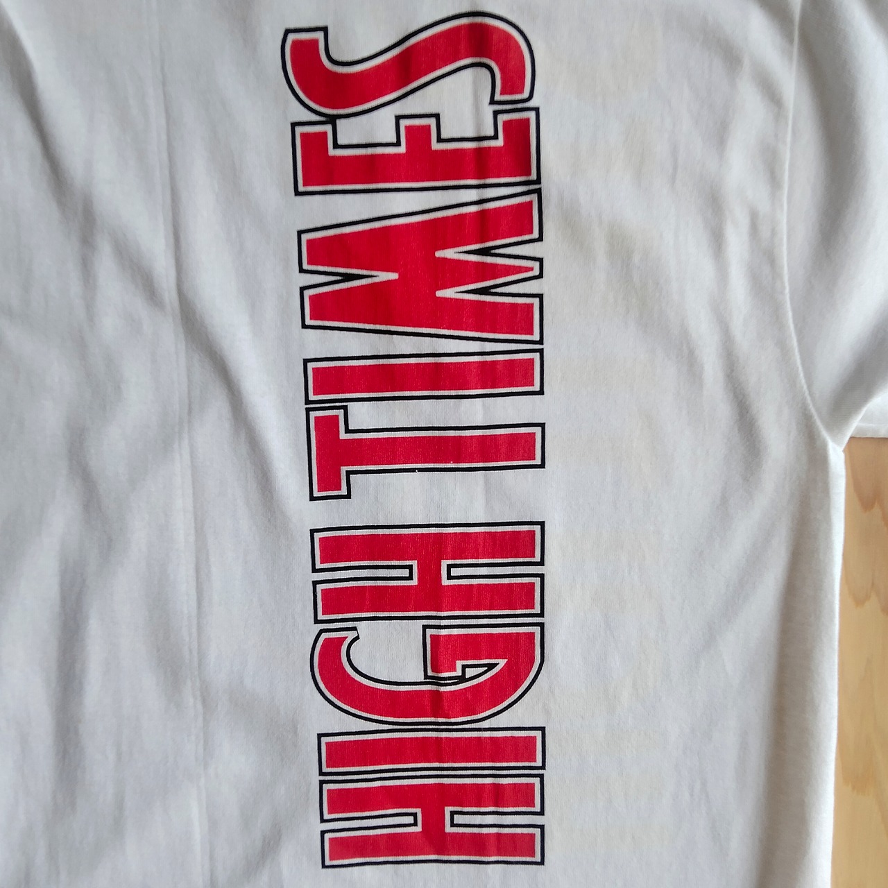 マリファナの花と”神は間違いをされません”の言葉が背中にプリントされ、胸には”High Times(ハイな時間)”がプリントされたTシャツです。
