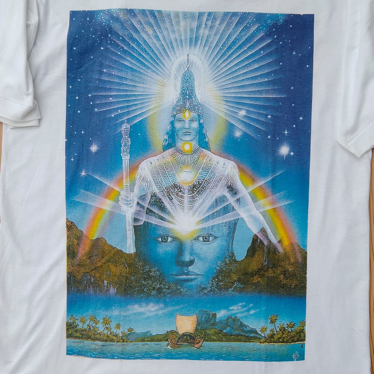 南太平洋の自然とポリネシアの神のような存在が大きくプリントされた、南国の風を感じるデザインのTシャツです。
